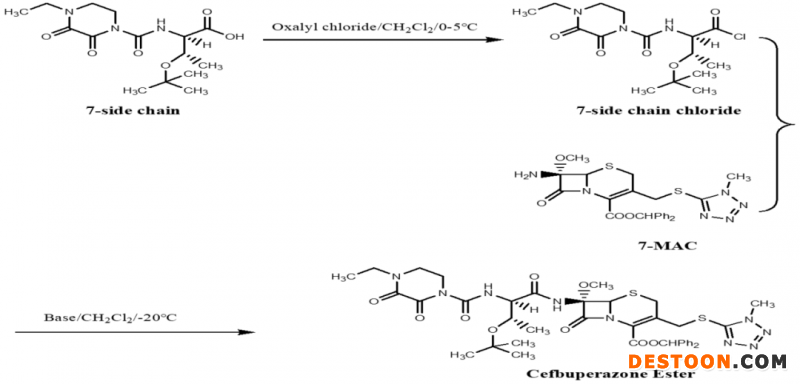 以7-ACA為起始原料,在路易斯酸存在下,與尾鏈連接的方式較多。